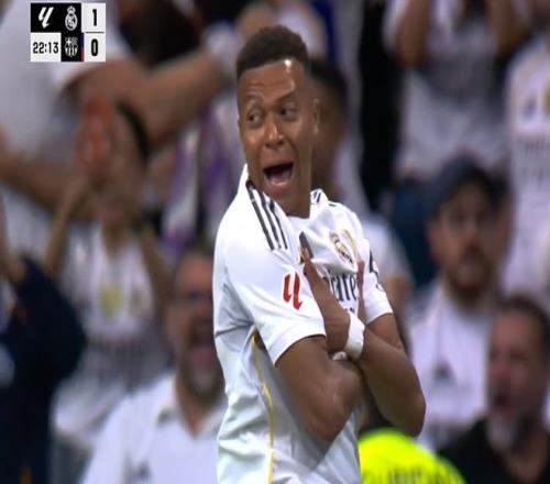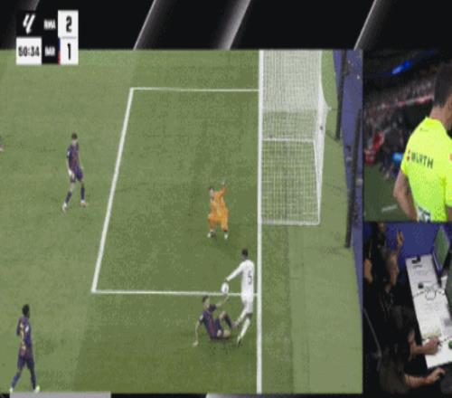 第49分钟,贝林厄姆禁区底线处传球弹在加西亚的手臂,主裁判观看VAR后给了点球,随后姆巴佩主罚打门被门将什琴斯尼扑出,皇马错失将比分扩大为3-1的机会。