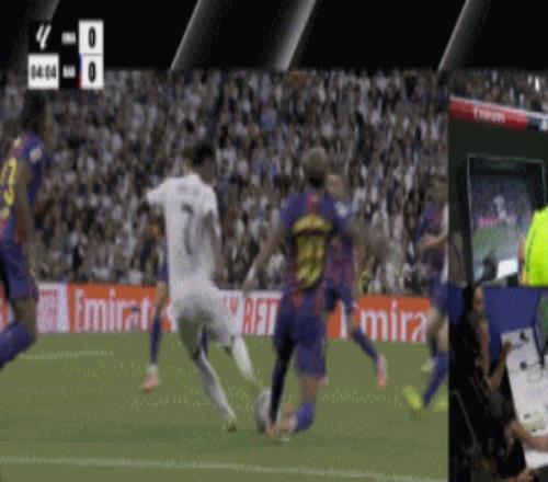 第12分钟,VAR介入之后再度做出了改判:姆巴佩外围直接一脚外脚背爆射入网,皇马全队疯狂庆祝,随后主裁判听从视频裁判的意见之后,示意姆巴佩越位在先,进球无效,巴萨再度逃过一劫。